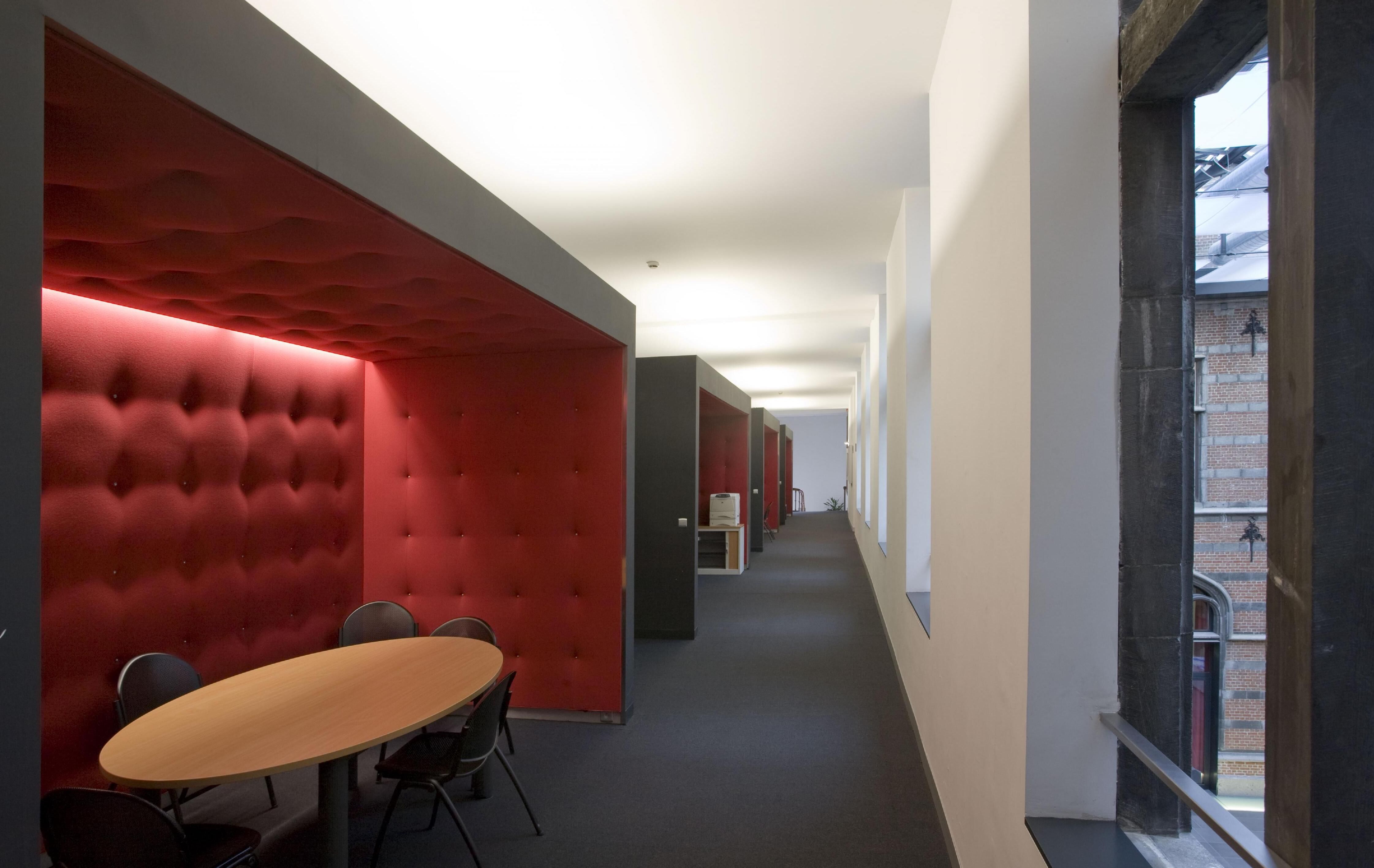 Op de eerste verdieping bevinden zich in de vroegere cellen, waarvan de buitenste kring is vergroot, kantoren met uitzicht op de kloostertuin. Elk kantoor heeft een open, gecapitonneerde box in de gang voor gebruik als zithoek, telewerkplek of kleine exporuimte. Ze vangen ook het lawaai op dat uit het atrium opstijgt.